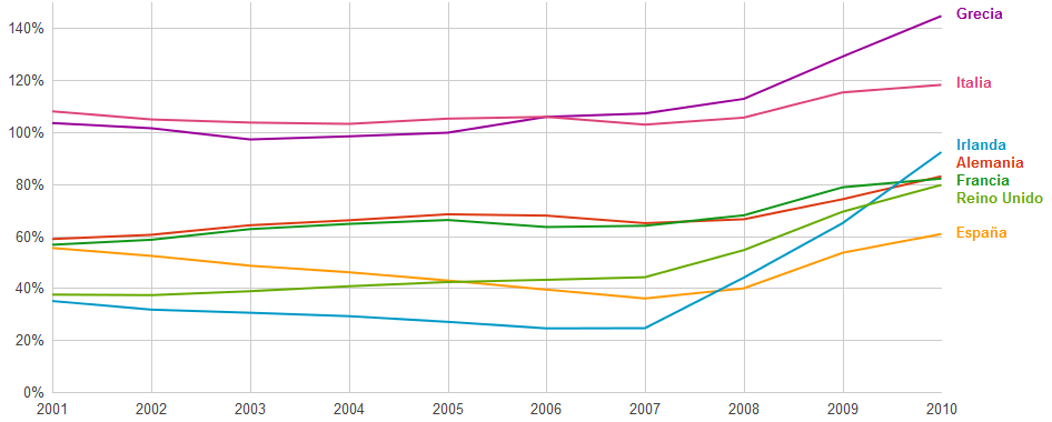 El gráfico muestra que Grecia e Italia poseen el mayor peso de deuda. Una variable importante, aunque no la única, para explicar que hayan estado en el centro de escena en los últimos meses. España, en cambio, muestra un nivel de deuda del 60% del PIB. Parte de la reciente atención se puede deber al cambio de Presidente de Gobierno y las expectativas de medidas económicas a tomar.