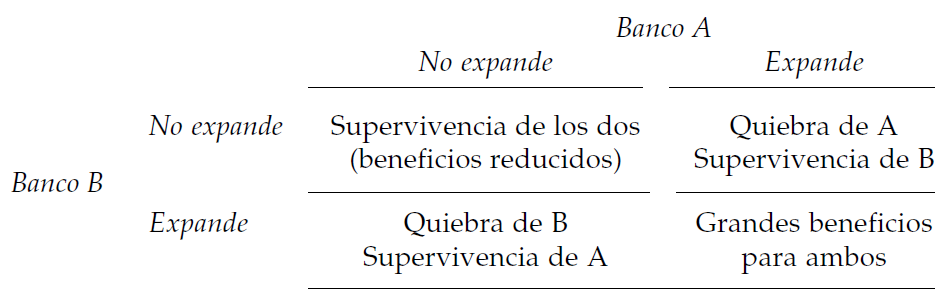 Huerta de Soto presenta un contexto de dos bancos que pueden emitir o no reservas fraccionarias. El caso es presentado como una situación de tragedia de los comunes, que es una aplicación del dilema del prisionero. Huerta de Soto presenta el siguiente juego (p. 519):