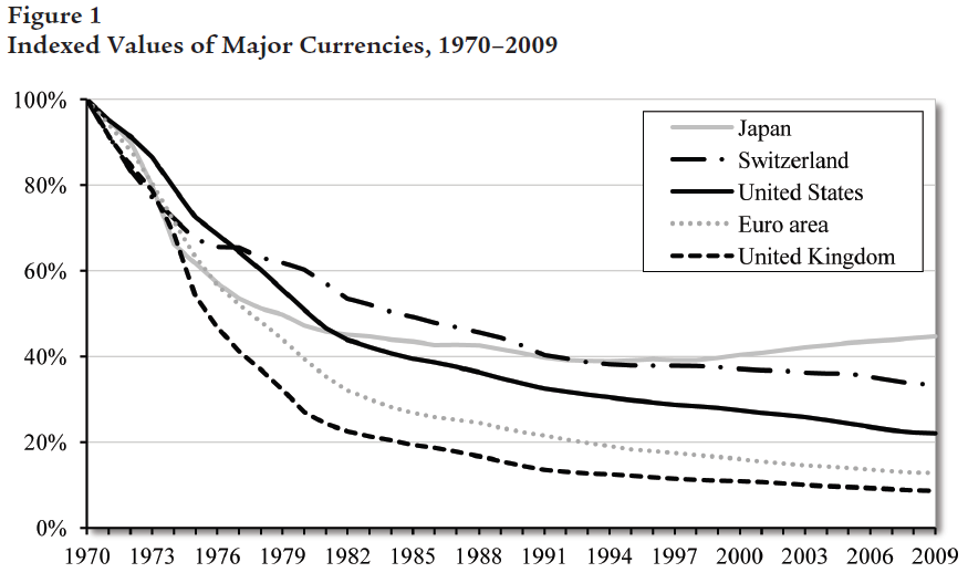 Para los que tengan tiempo, recomiendo la lectura. Pero creo que el siguiente gráfico que muestra la pérdida de poder adquisitivo de las monedas fiat más importantes dese 1970 a la fecha puede ser interesante.