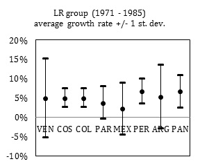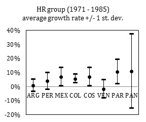 En primer lugar ordeno 8 países Latinoamericanos de tipo de cambio más flexible a menos flexible según el CV (coeficiente de variabilidad: stdev/mean) del tipo de cambio. Luego comparo el crecimiento promedio y desvío estándar entre 1971-1985 y 2002-2010 (1970-1980 y 2002-2007 son dos períodos de claros desvíos de la Fed respecto a la Regla de Taylor que coinciden con las dos crisis más importantes de la región.) La siguiente tabla muestra los CV par cada país para cada período. Los gráficos que le siguen muestran los resultados para el sector HR (high roundabout), MR (medium roundabout) y LR (less roundabout) para Argentina (ARG), Colombia (COL), Costa Rica (COS), Mexico (MEX), Panamá (PAN), Paraguay (PAR), Peru (PER) y Venezuela (VEN). Los datos de CV también son menores para el segundo período, lo que quiere decir que estos países tuvieron tipos de cambio menos volátiles.