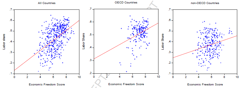 Uno de los tantos ejercicios que los autores realizan es comparar dos regresiones, una usando el PBI real como variable control y otra sin el PBI real. El dejar de lado el PBI real el factor explicativo de la variable de libertad económica se incrementa más de un 80%. Esto quiere decir que la libertad económica tiene una relación directa con la participación del ingreso del factor trabajo cuando asumiendo que el tamaño de la torta es fija. Esto también quiere decir que el crecimiento de la torta viene acompañado con porciones más grandes al factor trabajo.