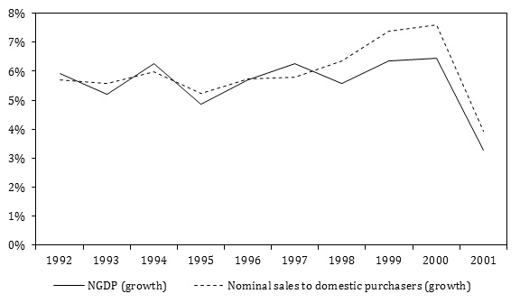 Otro ejemplo es las ventas finales a compradores domésticos en Estados Unidos, que de acuerdo a Niskanen es mejor estimación que el NGDP en lo que respecta a equilibrio monetario. Si se observa el período 1993-2001 se ve que el NGDP crece a una tasa estable alrededor del 5%, pero que las ventas finales a consumidores domésticos comienza a acelerarse a partir de 1997.