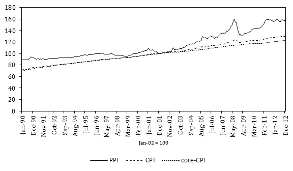 Uno de los argumentos del NGDP Targeting es que el período anterior a la crisis del 2008 muestra tasas anuales de crecimiento similares a las de la Gran Moderación, por lo que una política monetaria expansiva no puede haber sido el problema. El problema fue una caída del ingreso nominal (NGDP), no una expansión previa. El NGDP, sin embargo, es una aproximación al principio de lo que se estabiliza es el ingreso nominal de los factores de producción. Otra manera de ver, entonces, si hay o no desequilibrio monetario es comparar el crecimiento del PPI con el CPI y el core-CPI. El siguiente gráfico muestra que a partir del 2002 el precio de los factores de producción comienzan a crecer más rápido que el precio de los bienes y servicios de consumo. Entre diciembre 2001 y diciembre 2007 el PPI, CPI y core-CPI crecieron a una tasa promedio anual de 4.9%, 2.5% y 1.8% respectivamente.