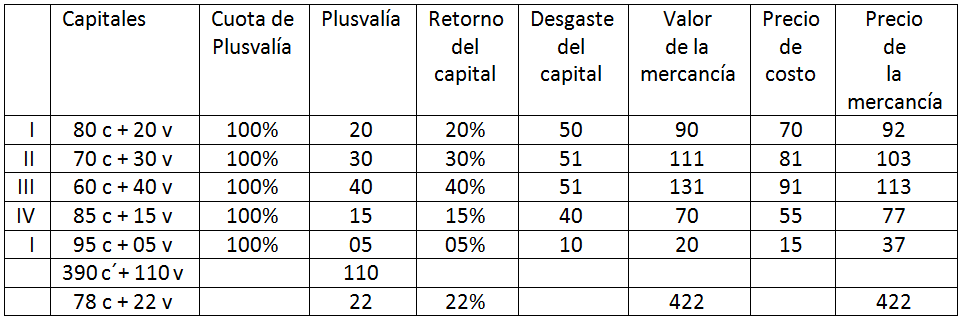 La primera columna muestra distintos sectores. La segunda columna muestra las distintas “composiciones orgánicas” del capital, o sea el porcentaje de capital constante y variable. Marx supone que el capital total es de 100 en los 5 sectores para poder hacer las comparaciones. La tercera columna muestra la tasa de plusvalía (o explotación), es el porcentaje de ganancia sobre el capital variable que es el único que genera plusvalía. Se supone que es del 100% en lo cinco sectores. La cuarta columna simplemente calcula la plusvalía sobre las dos columnas anteriores. La quinta columna calcula el retorno del capital la tasa de ganancia sobre el capital. La sexta columna supone el desgaste del capital que va a requerir de tiempo de trabajo socialmente necesario para reponerlo. La séptima columna es el valor de la mercancía determinado por el trabajo socialmente necesario. En el caso del Sector I este valor es la suma de 20 capital variable (trabajo socialmente necesario) más 20 de plusvalía (trabajo socialmente necesario apropiado por el capitalista) más 50 de desgaste (trabajo socialmente necesario para reponer capital). Total 90.