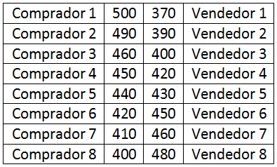 Si las personas valoran de distintas maneras un determinado bien entonces podemos ordenar su disposición a comprar de mayor a menor y su disposición a vender de menor a mayor. La siguiente tabla muestra una “maqueta” de mercado donde hay ocho compradores y ocho vendedores. Obviamente en el mundo real hay miles o millones de compradores y miles o millones de unidades a vender. Y suponemos para simplificar que cada comprador y vendedor quieren comprar 1 unidad. Se puede cambiar este supuesto pero en nada cambia la conclusión (por ejemplo podríamos suponer que el Comprador 7 vuelve a ser el Comprador 1 que por la segunda unidad está dispuesto a pagar $410)