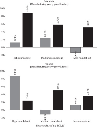 Para cada país divido sectores industriales en tres grupos: high-roundabout (HR), medium roundabout (MR), y low roundabout (LR). Según el ABCT, los grupos relativamente más roundabout deberían ser más sensibles a cambios en las tasas de interés (un resultado del average period de Hicks que comentaba en el post anterior.) Los siguientes gráficos muestran (1) los resultados esperados y (2) los resultados observados para Colombia y Panamá a nivel de PBI y a nivel manufacturas. Las barras negras representan un período de política monetaria expansiva (2002-2007) mientras que las barras grises representan un período con tasas de interés más alineadas con la Regla de Taylor.