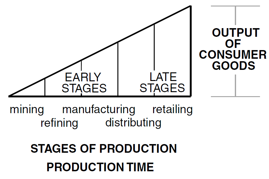 El modelo de Garrison se basa en los «stages of production» que conforman el Triángulo de Hayek que muestra el siguiente gráfico.