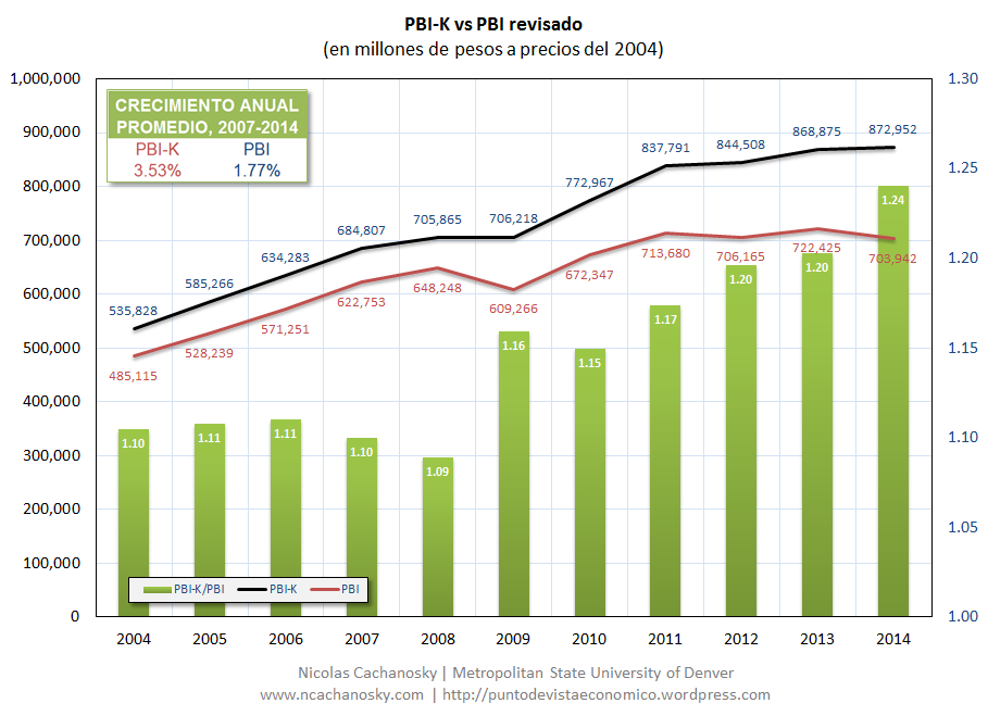 El siguiente gráfico muestra los datos oficiales del PBI según el kirchnerismo (PBI-K), los datos oficiales revisados, y el la sobre-estimación del PBI por la administración kirchnerista (PBI-K/PBI). Como se puede ver, al 2014 el kirchnerismo había inflado artificialmente el PBI alrededor de un 24%. Cuando comenzó la manipulación, algunos sugerimos que la verdadera motivación no era pagar menos deuda por bonos que ajustan por inflación, sino por cuestiones políticas. Inflar los datos del PBI resulta en mayores pagos de deuda a través de los cupones del PBI emitidos en los cnajes de deuda luego del default del 2001.