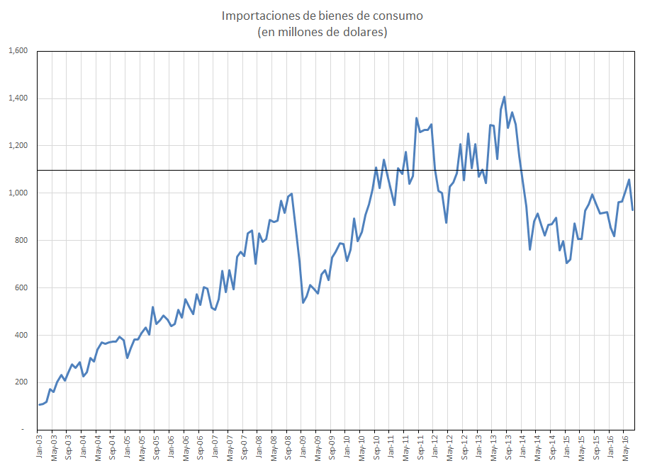 En primer lugar, la Argentina no está transitando una fuerte recesión ni está siendo inundada por productos extranjeros. Más bien se están percibiendo los primeros datos de una leve recuperación en la economía o de un “veranito económico.” Las importaciones de bienes de consumo, ya sean medidas en valores (millones de dólares) o en un índice de cantidad, se encuentran por debajo de los máximos valores que hemos tenido durante el kirchnerismo. No es lo mismo un repunte que una inundación de importaciones. El primer gráfico muestra las importaciones en valores y el segundo en índice de cantidades. Ambos casos contradicen el argumento de que hay demasiadas importaciones.