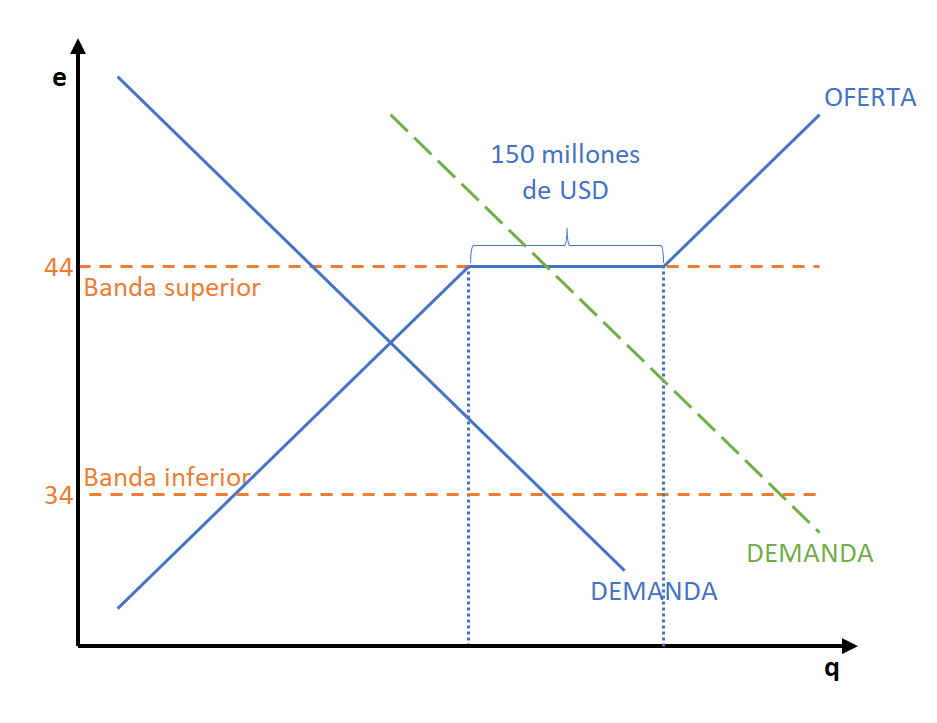 Si el tipo de cambio cae por debajo del límite inferior, entonces el BCRA comprará los dólares necesarios para que el tipo de cambio no caiga por debajo de 34. Si el tipo de cambio supera el límite superior, entonces el BCRA licitará hasta 150 millones de dólares por día al tipo de cambio de la banda superior.