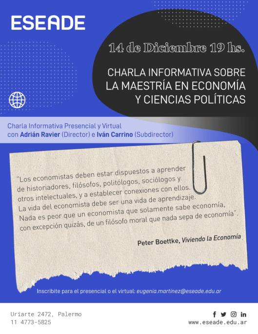 Escriba a eugenia.martinez@eseade.edu.ar o a maestrias@eseade.edu.ar para inscribirse a la charla informativa. Pueden asistir a ESEADE presencial, o desde un aula virtual sincrónica, para lo cual deben solicitar el link a estos dos correos mencionados.