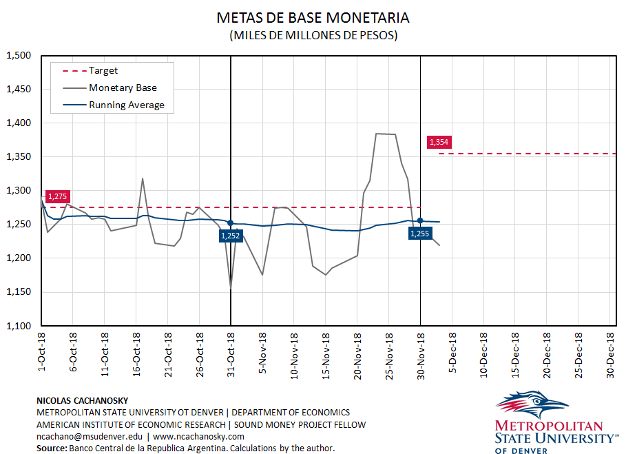 El siguiente gráfico muestra las metas de BM a fines del 2018 (rojo punteado), la base monetaria diaria (en gris) y el promedio acumulado (azul). En el último comunicado del BCRA, las autoridades monetarias han expresado la intención de volver a sobre cumplir la meta en diciembre por un mínimo de 16 mil millones de pesos.
