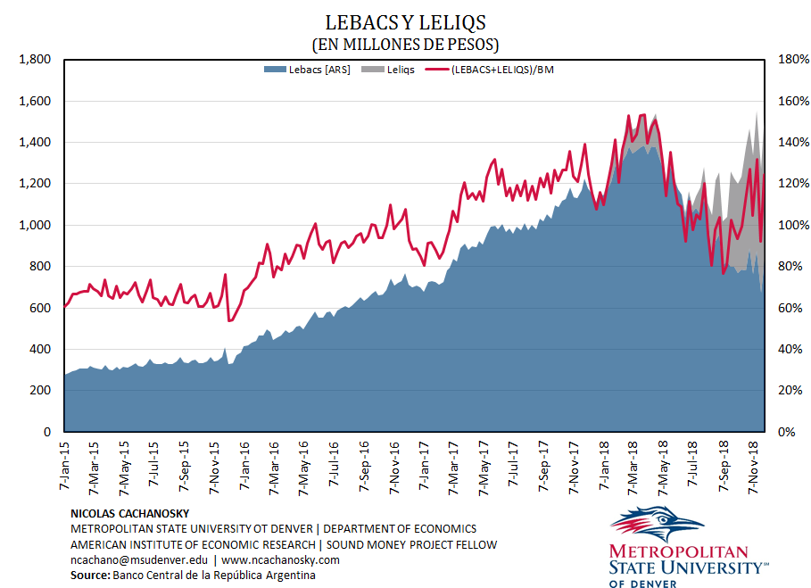 Sin embargo, el plan parece ser más un canje que un desarme. A la par que el BCRA reduce el stock de Lebacs aumenta la emisión de Leliqs. La principal diferencia entre las Lebacs y las Leliqs es que las primeras podían estar en manos del público y de entidades financieras, mientras que las Leliqs sólo pueden estar en manos de entidades financieras. Uno de los argumentos para este cambio es que los bancos, al tener un mejor dominio del mundo financiero que el ciudadano medio, es menos proclive a comportarse de manera irracional («animal spirits»?) y liquidar posiciones de Lebacs produciendo tensiones cambiarias inncesarias. Otro motivo más suspicaz es que es más fácil para el BCRA y el gobierno presionar a un grupo de bancos para que no liquiden posiciones de Leliqs que a un gran número de individuos tenedores de Lebacs.
