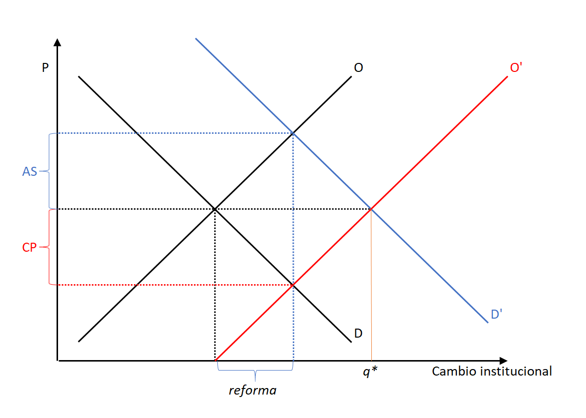 En la medida que no haya un aumento en la demanda de cambio institucional, un aumento en la oferta implica un costo político (CP) que los gobiernos de turno suelen no estar dispuestos a pagar. Si, en cambio, aumenta la demanda, entonces la sociedad está más dispuesta a afrontar el costo de al reforma. Aumenta el apoyo social (AS). Por ejemplo, la sociedad estaría dispuesta a afrontar aumentos de tarifas en servicios públicos, una baja del gasto público, etc.