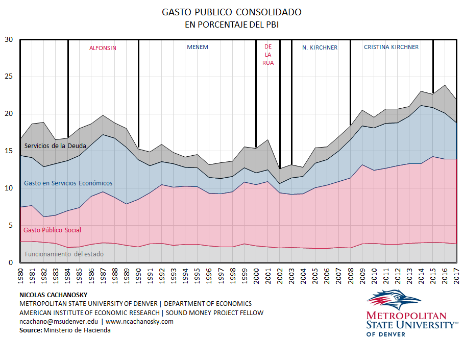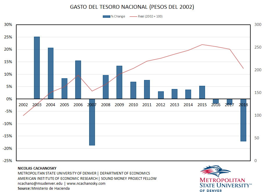 Salvo la crisis del 2007, el kirchnerismo ha aumentado de manera consistente el gasto en términos reales. El problema de la deuda es un problema de nivel de gasto. El problema de la deuda no se soluciona con un «reperfilamiento» o canje de bonos, se soluciona con una reforma del estado que disminuya el gasto a niveles sostenibles.