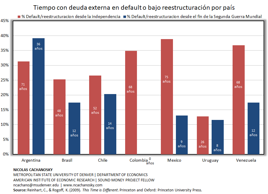 Argentina tiene un triste track-record en términos de defaults y reestructuraciones de deuda. Desde su independencia, Argentina ha pasado el 30% de su tiempo en default (o reestructuración). Valor comparable con otros países de la región. Sin embargo, desde fines de la Segunda Guerra Mundial ha estado en default (o reestructuración) casi un 40% del tiempo, mientras que el resto de los países de la región han disminuido sus problemas de deuda.