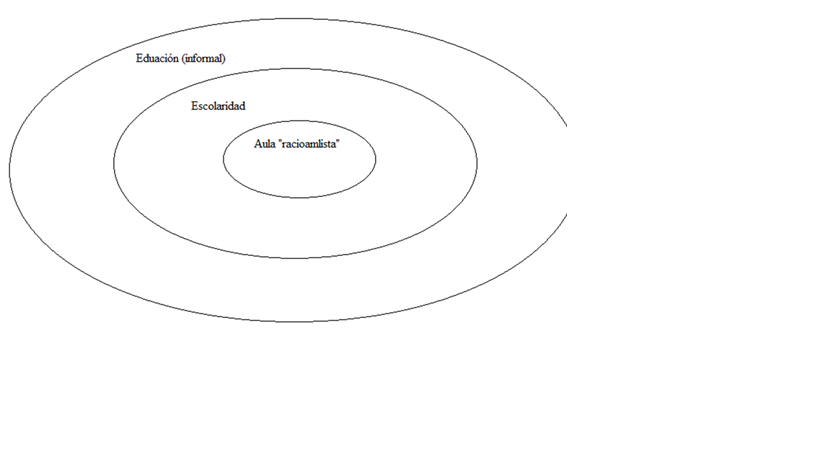 El tercer ámbito es el aula de la educación formal-estatal-positivista concebida a partir del Iluminismo del s. XVIII, la escuela redentora a cuyos límites aludían Gozzer y Zanotti.