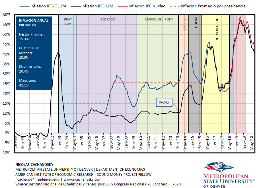 Esto se observa con dos gráficos. El primero muestra la inflación interanual de 1999 a la fecha. Luego de la crisis del 2001, se percibe una tendencia al alza comenzando a fines del 2003 o principios del 2004. La inflación promedio por presidencia aumenta (línea roja punteada). Los picos de inflación se superan en el tiempo.
