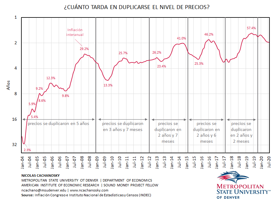 El segundo gráfico muestra, para cada tasa de inflación interanual, cuando tiempo llevaría en duplicarse el nivel de precios. Por ejemplo, en abril del 2008, con una inflación interanual de 29.2% el nivel de precios se duplica en 2.7 años (2 años y 9 meses). El gráfico también muestra la aceleración del aumento en el nivel de precios. Comenzando en enero del 2004, el nivel de precios se duplicó en 5 años, para luego hacerlo en 3 años y 7 meses, 2 años y 7 meses, 2 años y 6 meses, y finalmente 2 años y 2 meses.