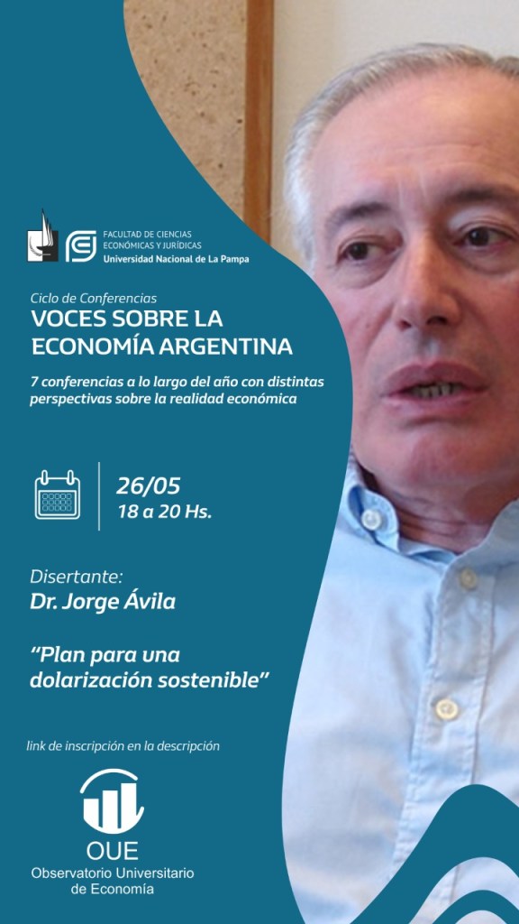Continuando con el Ciclo de conferencias “Voces sobre la economía argentina” organizado por el Observatorio Universitario de Economía de la Facultad de Ciencias Económicas y Jurídicas de la Universidad Nacional de La Pampa, hoy 26 de mayo a las 18 horas el Dr. Jorge Avila dictará una conferencia titulada “Plan de Dolarización Sostenible”.
