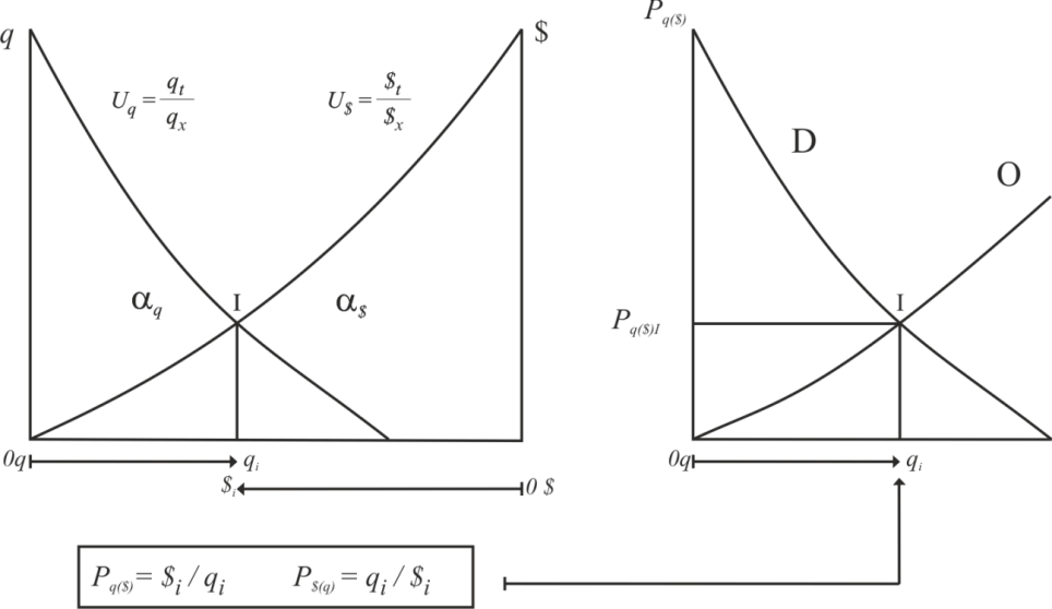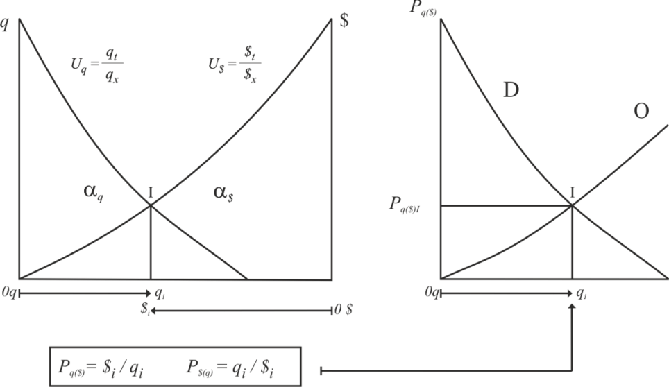 Mientras la ordenada muestra las cantidades de q, la curva Uq representa, con lectura tradicional de izquierda a derecha, el valor subjetivo que le asignamos a cada unidad de qt. La curva U$ representa, con lectura invertida de derecha a izquierda, el valor subjetivo que le asignamos a cada unidad $t, representada en la abscisa. [7]