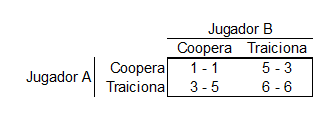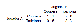 La forma de resolver este dilema es estableciendo un “contrato social” para crear una agencia que detente el monopolio de la coerción y la utilice para castigar la no cooperación. Así, con un castigo a la traición, digamos, de 3 unidades, el dilema se transformaría, para quedar de esta forma