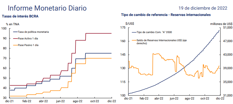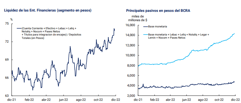 Un complemento lo podemos encontrar en este gráfico tomado del informe diario del BCRA del 19 de diciembre de 2022, donde se observa que si bien la base monetaria está relativamente estable, los otros pasivos siguen escalando.