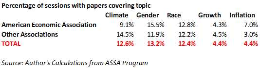 “Para resumir: hubo aproximadamente tres veces más sesiones con artículos sobre raza, género y clima que sesiones sobre temas de inflación o crecimiento. Para la conferencia en su conjunto, eso significa que el 13,2 % de todas las sesiones trataron cuestiones de género, el 12,6 % el clima, el 12,4 % la raza, frente a solo el 4,4 % de la inflación y el crecimiento (algunas sesiones incluyeron más de uno de estos temas enumerados).”[1)