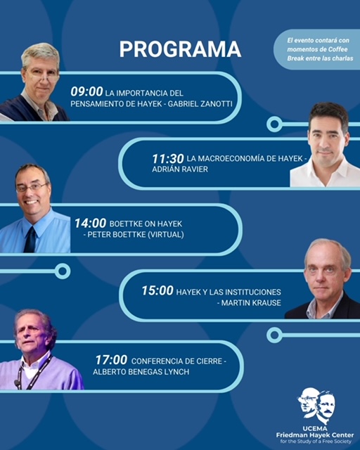 El 4 de diciembre durante todo el día contaremos con un espacio educativo en el que especialistas de la talla de *Zanotti, Ravier, Krause, Benegas Lynch* y *Peter Boettke* analizarán los temas clave del pensamiento hayekiano.