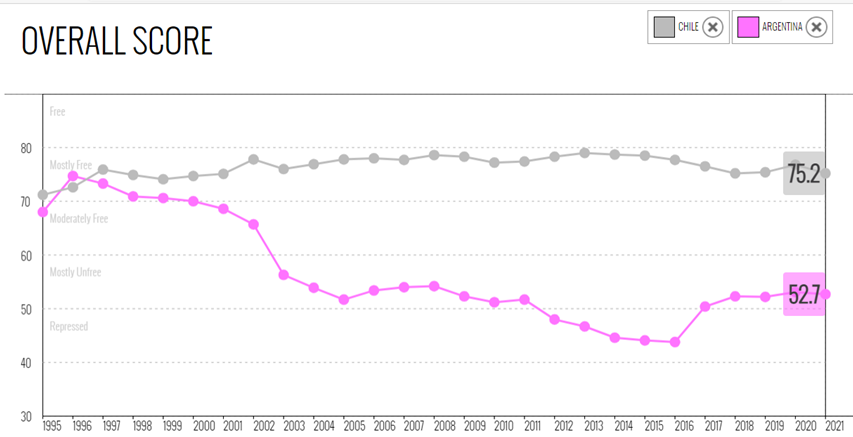 El Index of Economic Freedom permite graficar la evolución del indicador por país, y también hacer comparaciones. Quizás la nota más saliente resulte de observar que en 1996 Argentina superaba a Chile, y hoy, a pesar de la mejora durante el gobierno de Mauricio Macri, sigue mostrando un resultado 20 puntos inferior a su vecino. Quizás allí radiquen los fundamentos que pueden explicar que mientras Chile reduce la pobreza, Argentina la ha incrementado.