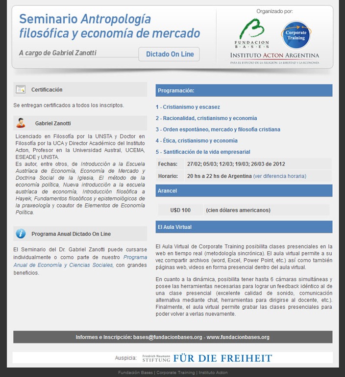 Fundación Bases junto a Corporate Training e Instituto Acton Argentina ofecen un seminario online dictado por Gabriel Zanotti sobre “Antropología filosófica y economía de mercado.”