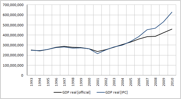 ¿Hay motivos para creer que el PBI real se encuentra sobrestimado por datos dudosos en el IPC? El siguiente gráfico muestra el PBI real oficial (color negro) junto al PBI real obtenido del PBI nominal pero usando el IPC oficial en lugar del deflactor (color azul). Al comparar las dos series vemos dos cosas importantes. En primer lugar, ambas series son muy similares hasta el 2005. En segundo lugar, el PBI real por IPC comienza a crecer más rápido que el oficial a partir del año 2006. Esto se debe a que la inflación según el IPC es crónicamente menor a la inflación calculada por el deflactor. Al transformarse el PBI nominal en real, se le quita menos inflación de la real, por lo que el PBI real muestra un cambio en cantidades mayor al real.