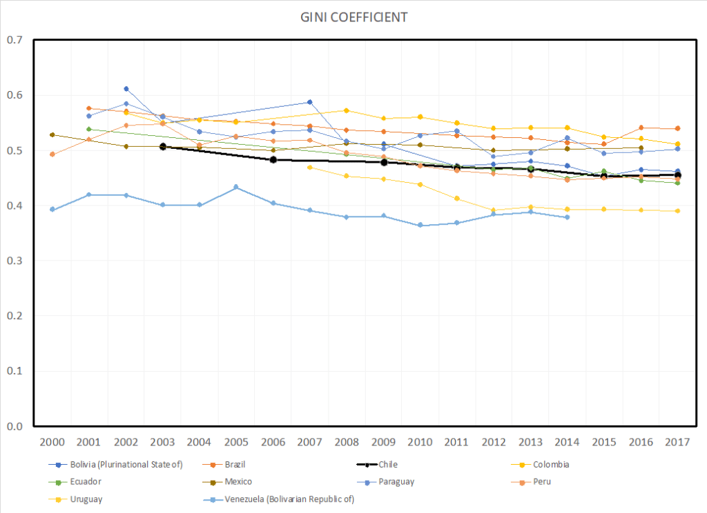 Dos cuestiones a resaltar. En primer lugar no se observa que Chile posea una peor distribución del ingreso que otros países; por el contrario, parece encontrarse en una mejor situación que el promedio de los países representativos en el gráfico. Si fuese cierto que la distribución del ingreso en Chile es significativamente peor que al de otros países, esto deberíamos verlo en el gráfico. De hecho, el gráfico tiene sólo dos países con una clara mejor distribución del ingreso, (1) Uruguay y (2) Venezuela. ¿Se justifica obtener esa mejora en la distribución del ingreso a costa de volverse una Venezuela (situación que la izquierda oscila entre ignorar y sostener que no es un verdadero régimen socialista) cuando se puede ser Uruguay?