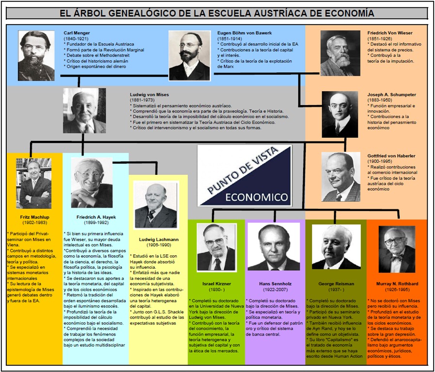 Tras exponer un gráfico con la familia keynesiana, varios lectores solicitaron trabajar en un árbol genealógico austriaco. Aquí lo tenemos, pero posiblemente sea demasiado simplificado. Los comentarios de los mismos lectores pueden agregar lo que falte o corregir mis errores.