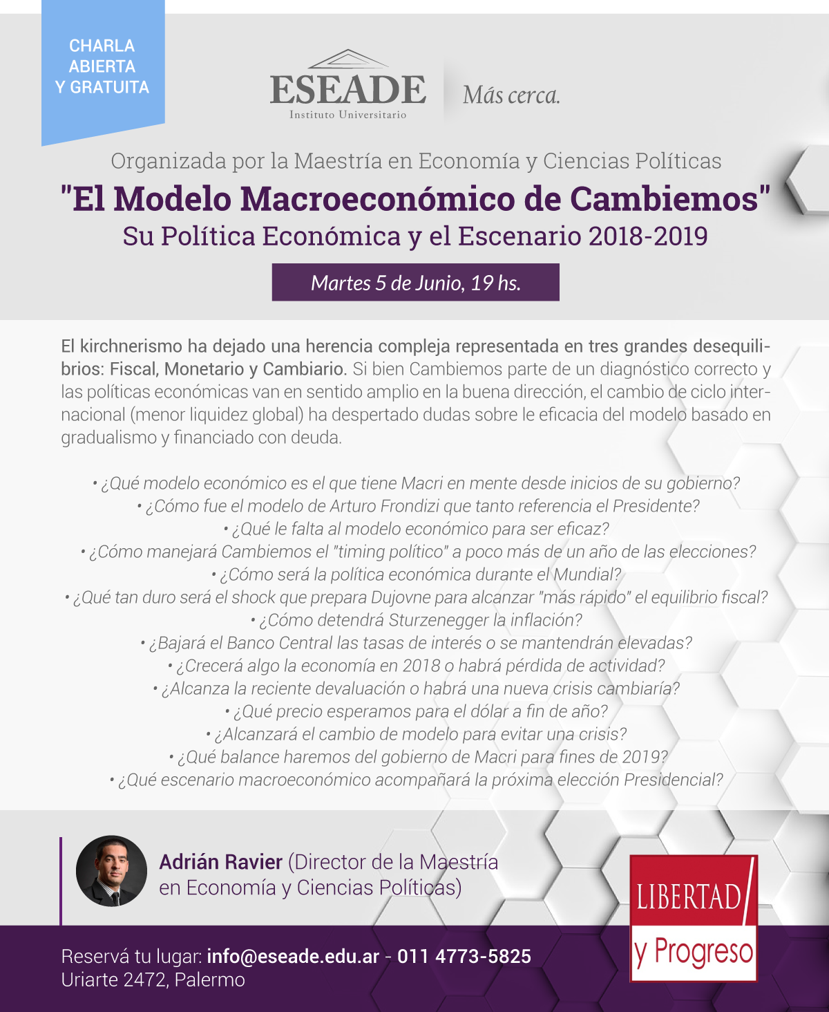 Charla Abierta y Gratuita en ESEADE – El modelo macroeconómico de Cambiemos. Su política económica y el escenario 2018-19 – Martes 5 de junio, 19 hs